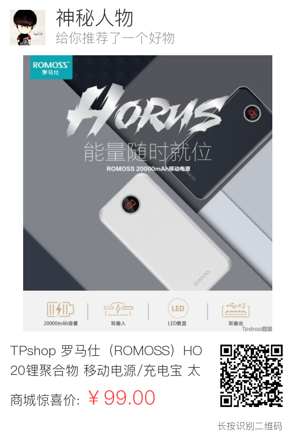 TPshop 罗马仕(ROMOSS)HO20锂聚合物 移动电源/充电宝 太阳神 20000毫安LED数显屏 白色 苹果/安卓双输入 手机/平板通用