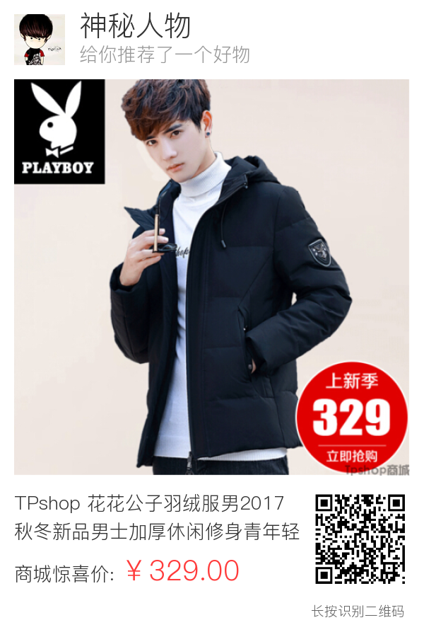 TPshop 花花公子羽绒服男2017秋冬新品男士加厚休闲修身青年轻薄短款连帽外套男装