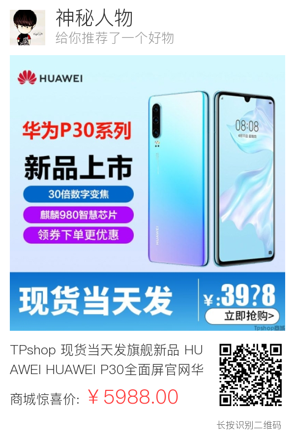 TPshop 现货当天发旗舰新品 HUAWEI HUAWEI P30全面屏官网华为p30pro手机