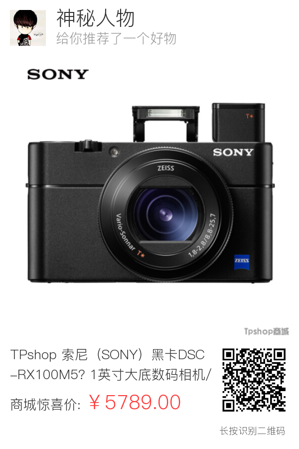 TPshop 索尼(SONY)黑卡DSC-RX100M5? 1英寸大底数码相机/卡片机 蔡司镜头(WIFI/NFC 4K视频 RX100V/黑卡5)