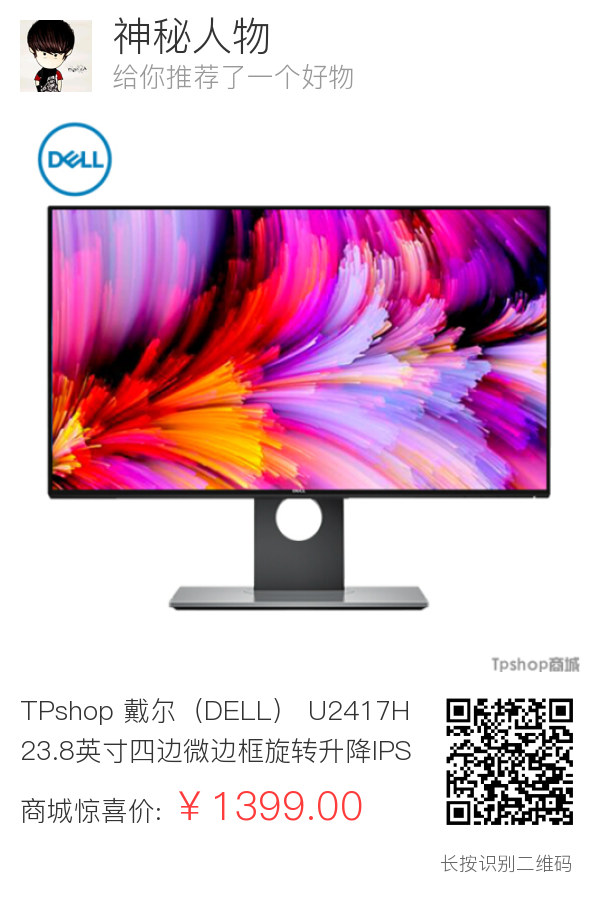 TPshop 戴尔(DELL) U2417H 23.8英寸四边微边框旋转升降IPS屏 出厂色彩校准 99%sRGB 电脑吃鸡显示器